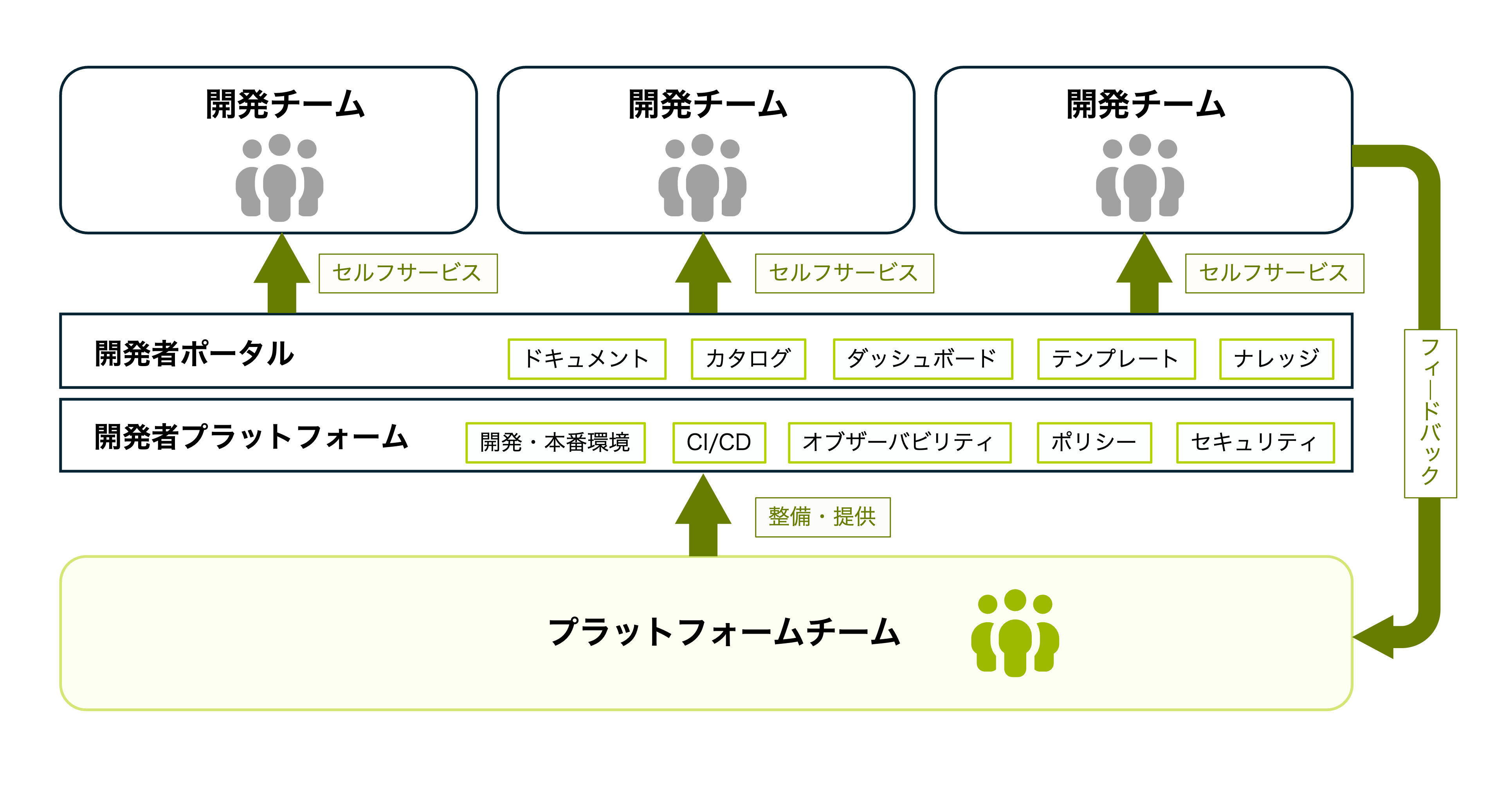 プラットフォームは、開発チームがセルフサービスで自律的に開発・デプロイできるように整備します。開発者が直感的に操作できるインターフェースを導入し、効率的な開発と情報共有をサポートします。社内のインフラを支えるインフラチームは能動的に動く「プラットフォームチーム」へと進化し、開発者に対して継続的に価値を提供します。