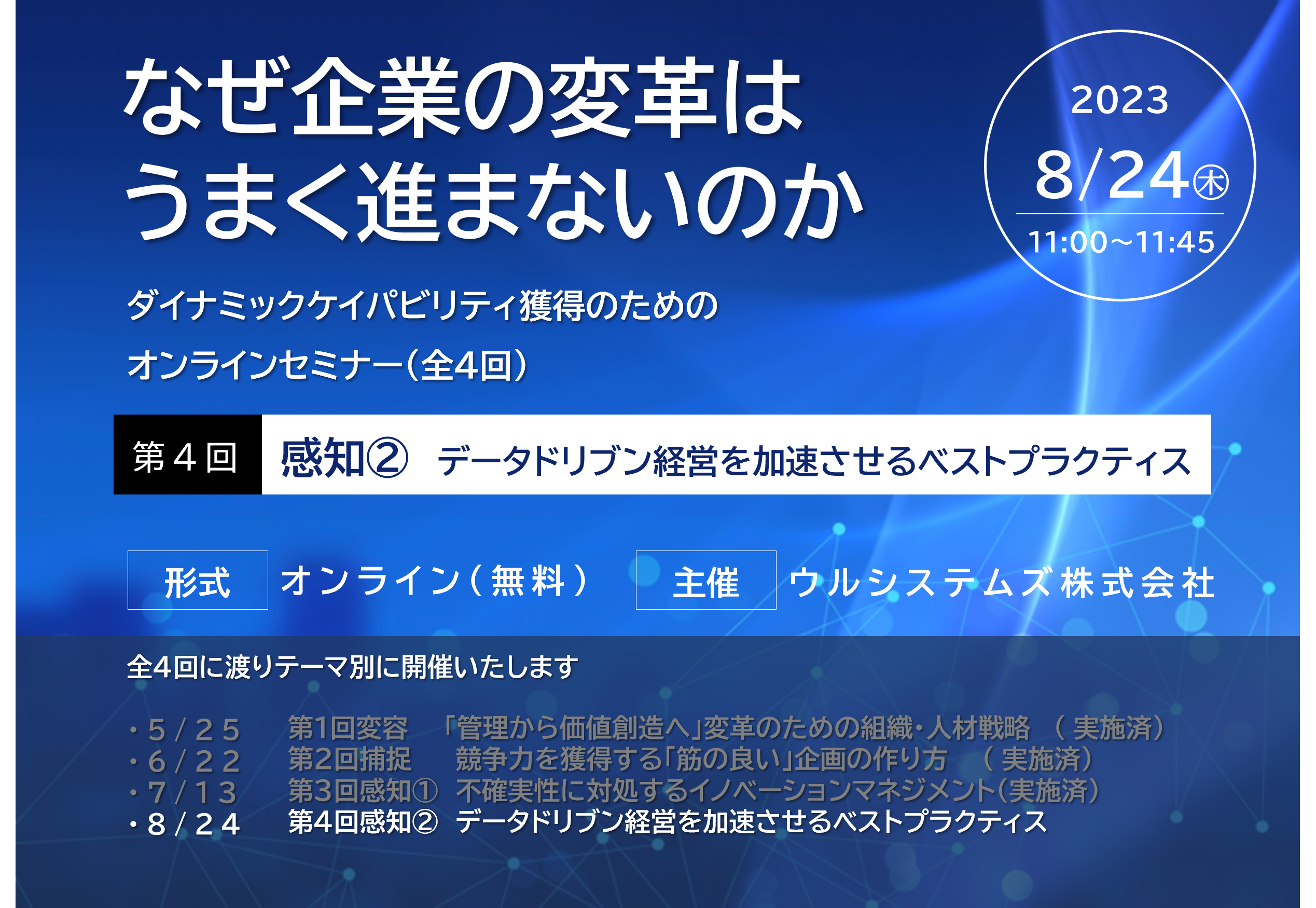 世界における不確実性の高まり、技術革新、顧客ニーズの変化などビジネスを取り巻く環境は急速に変化しています。この変化に対応しながら企業競争力を維持するために、企業は、自らを変革し続けていく必要があります。この「自らを変革し続けていく」ために企業が備えるべき能力が「ダイナミックケイパビリティ」です。ダイナミックケイパビリティは元々は2020年に製造業向けに提唱されましたが、新型感染症や戦争の発生など将来の見通しがより不透明になった時代においては、すべての業種・業態で身に着けるべき能力であると言われています。ウルシステムズでは、この「ダイナミックケイパビリティ」の要素である「感知」「捕捉」「変革」をテーマとして全4回の企業変革力向上セミナーを開催いたします。